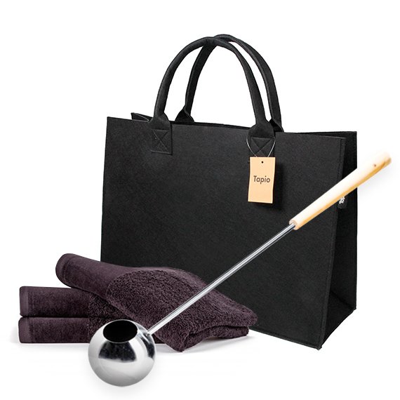 Lahjasetti sisältää huovasta valmistetun kassin, design löylykauhan ja yhden kylpypyyhkeen.