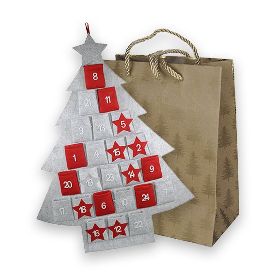 Lahjasetti sisältää seinälle ripustettavan täytettävän joulukalenterin sekä lahjakassin.