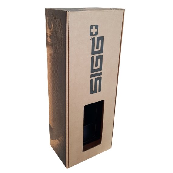 Yksittäispakkaus Sigg-juomapullolle. Ulkomitat 31 x 12,5 x 8 cm.
