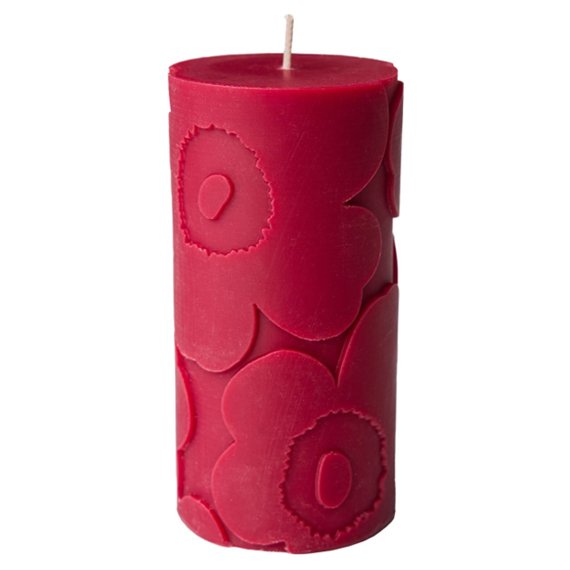 Marimekon kauniin pöytäkynttilän pintaa koristaa rakastettu Unikko-kuviointi. Valmistettu rypsivahasta. Paloaika noin 100 h. Mitat: 6,5 x 14 cm.