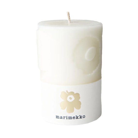 Marimekon kauniin pöytäkynttilän pintaa koristaa rakastettu Unikko-kuviointi. Valmistettu rypsivahasta. Paloaika noin 58 h. Mitat: 6,5 x 10 cm.