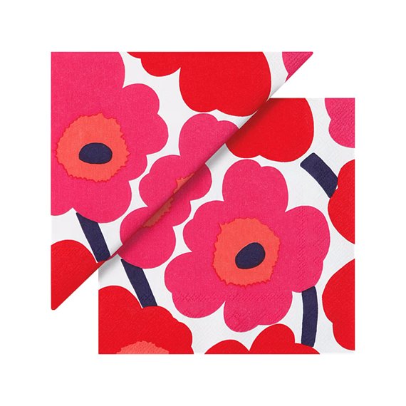 Näyttävät Marimekon Unikko lautasliinat. Klassisen kuosin suunnitteli Maija Isola vuonna 1964. Kotimaiset lautasliinat ovat Havin valmistamat ja ne ovat painettu Imatralla 3-kertaiselle pehmopaperille. Lautasliinoille on myönnetty Avainlippu, Joutsenmerkki ja FSC. Koko 24 cm.