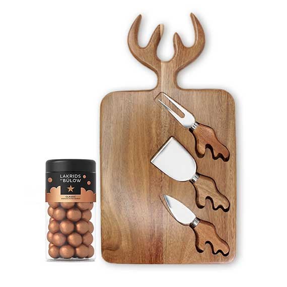 Lahjasetti yhdistää tarjoilualustan poronsarvikahvoilla ja kolmella juustoveitsellä, jotka tekevät juustojen tarjoilusta helppoa ja tyylikästä. Setin kruunaa herkullinen Lakrids by Bülow -lakritsipakkaus
