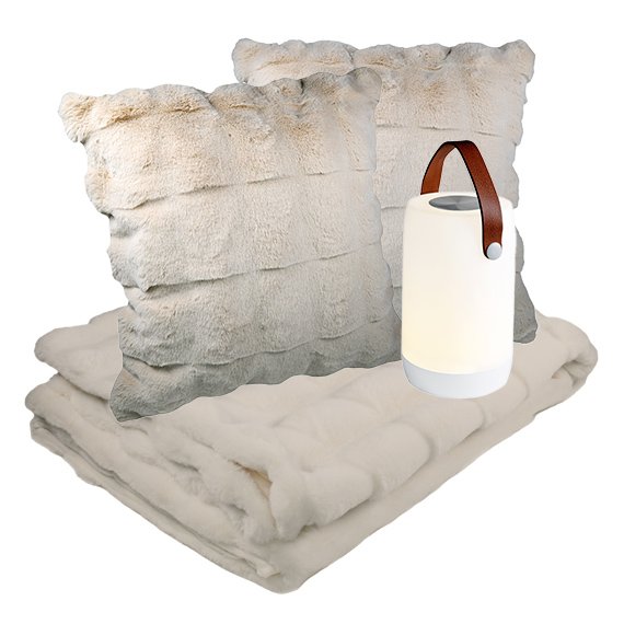 Lahjasetti yhdistää pehmeän, aaltoilevapintaisen huovan ja kaksi koristetyynyä, jotka tuovat rauhallisen ja elegantin tunnelman kotiisi. Setin kruunaa terassivalo, joka luo miellyttävän valonhetken niin sisällä kuin ulkona.