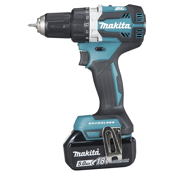 Tekniset tiedot: • virtalähde: akku • jännite: 18 V • akkutyyppi: LXT • akun suojausjärjestelmä • mukana akku 2 x 5,0 Ah ja laturi • latausaika 18 V 5,0 Ah: n. 45 min • kierrosluku: 0–500 / 0–2000 min⁻¹ • vääntövoima kova / pehmeä: 54 / 30 Nm • momentin säätöalua: 21 • porauskapasiteetti puu: 38 mm • porauskapasiteetti teräs: 13 mm • poraistukan kierre: 1/2"-20UNF" • poraistukan kapasiteetti: 1,5–13 mm • led-valo • äänenpainetaso (LpA): 76 dB(A) • melun toleranssi (K-tekijä): 3 dB(A) • tärinäarvo poraus: ≤ 2,5 m/s² • tärinän toleranssi (K-tekijä): 1,5 m/s² • paino akulla (EPTA): 1,5–1,8 kg • mitat (p x l x k): 172 x 79 x 261 mm