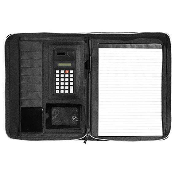 Kansiossa on irrotettava A4-kokoinen lehtiö, aurinkokennoista energiansa saava laskin sekä erikokoisia taskuja kynille, käyntikorteille ja esitteille. Kansio on suljettavissa vetoketjulla. Koko 33 x 26 cm.