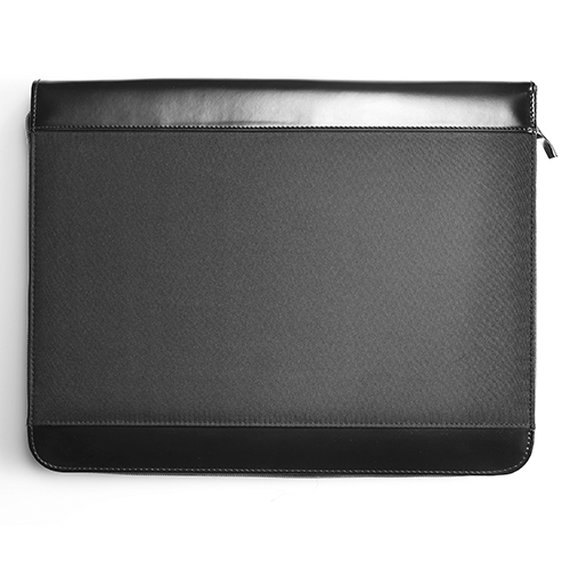 Kansiossa on irrotettava A4-kokoinen lehtiö, aurinkokennoista energiansa saava laskin sekä erikokoisia taskuja kynille, käyntikorteille ja esitteille. Kansio on suljettavissa vetoketjulla. Koko 33 x 26 cm.