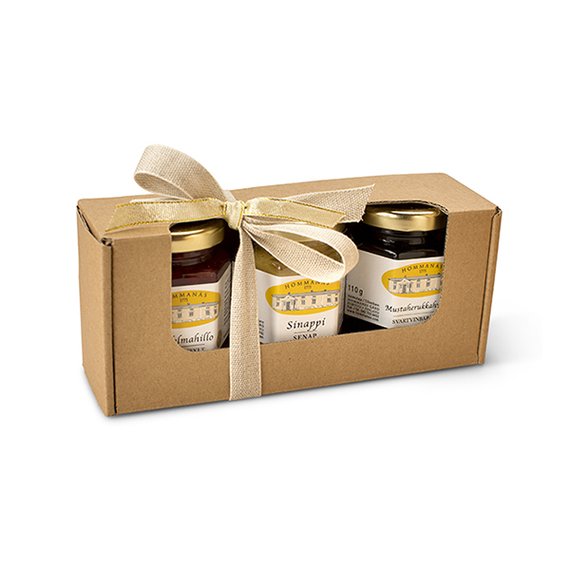 Lisä- ja säilöntäaineeton. Pieni lahjalaatikko on täydellinen lisä joulupöytään. Se sisältää kolme tuotetta: kirsikkahillon 125g, sinapin 110g ja mustaherukkahyytelön 125g.