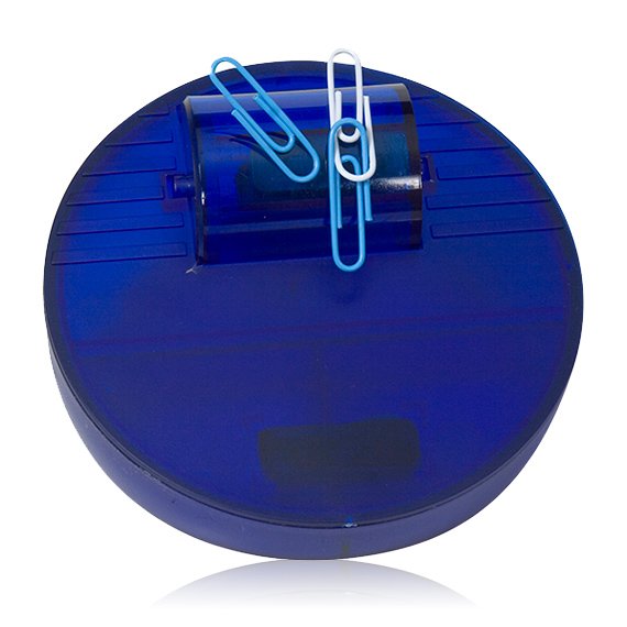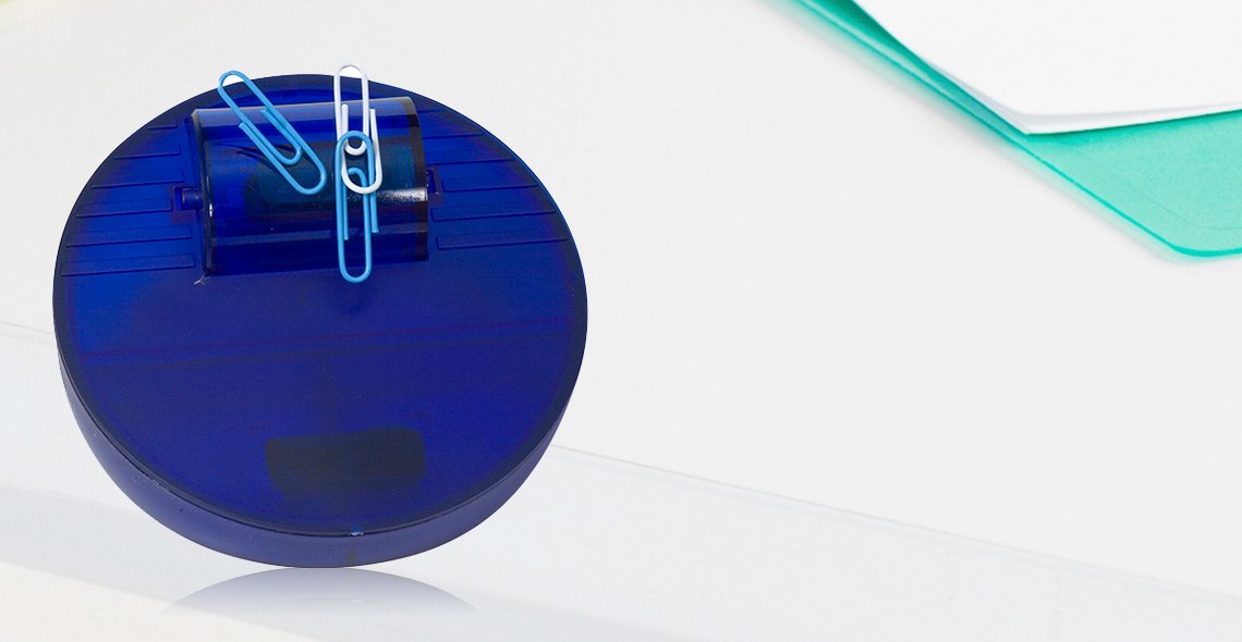 Työpöydän klassikkotuote, jossa on pettämätön mekanismi. Paperiliittimet pysyvät tiiviisti kannen alla, josta pyörivä rulla nostaa ne esiin. Magneetin ansiosta paperiliittimet jäävät kiinni säiliön pintaan eivätkä putoile pöydälle. Värinä pirteä huurrettu sininen. Mukana pussillinen sini-valkoisia paperiliittimiä. Harmaa lahjapakkaus.