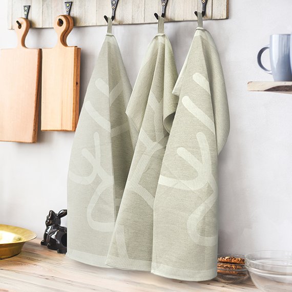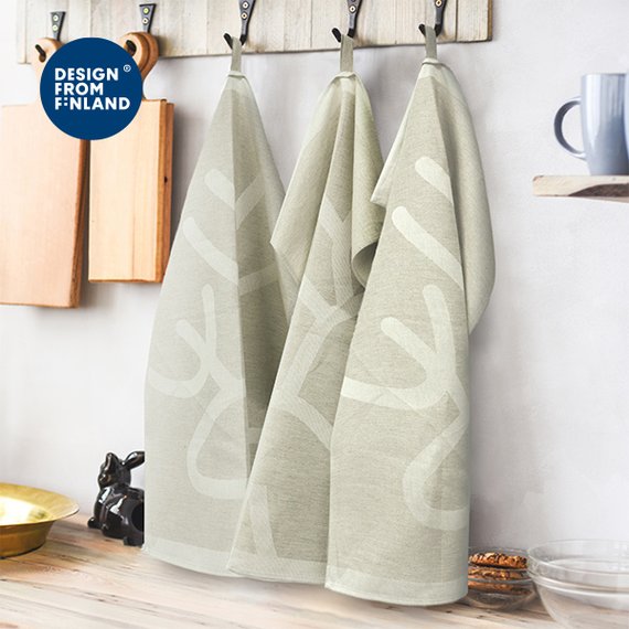 Kotimaista tunnelmaa keittiöön. Ihanalla porokuosilla varustettu vaalea keittiöpyyhe tuo suomalaisen luonnon osaksi sisustusta. Kangas 48 % pellavaa, 52 % puuvillaa. Koko 47 x 70 cm.