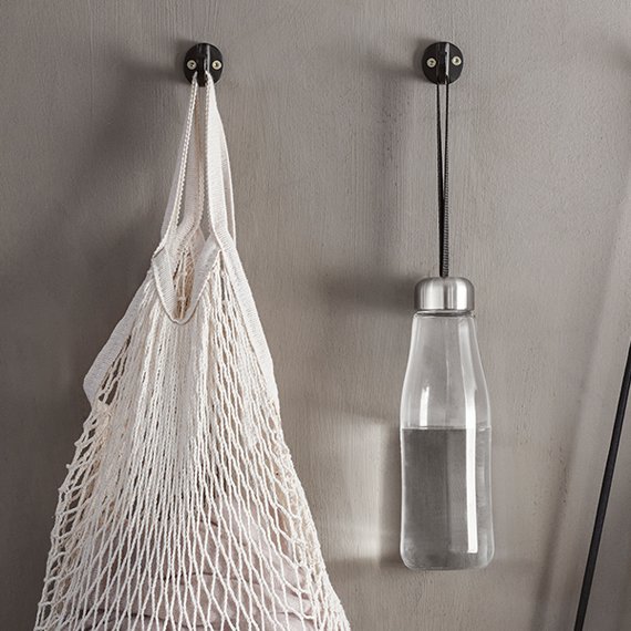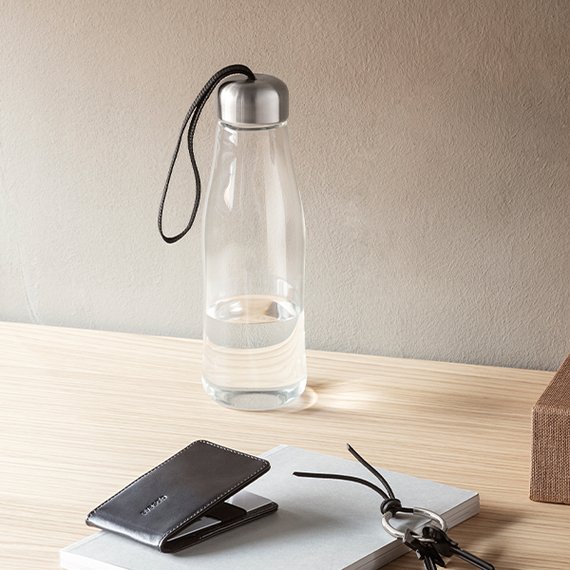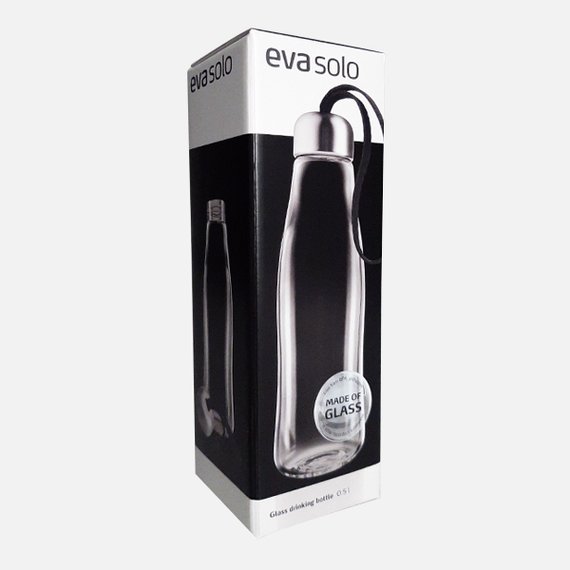 Tyylikäs Eva Solon musta juomapullo on 100 % vedenpitävä, joten sen voi huoletta sujauttaa laukkuun pelkäämättä sen vuotamista. Kätevän nauhan ansiosta pulloa on helppo kantaa mukana. Pullon materiaali on kestävää borosilikaattilasia, korkki harjattua ruostumatonta terästä. Ei sisällä BPA:ta, ftalaatteja tai lyijyä. Lasipullo kestää konepesun, mutta korkki tulee pestä käsin. Korkeus 225 mm, halkaisija 7 cm, paino 0,23 kg.