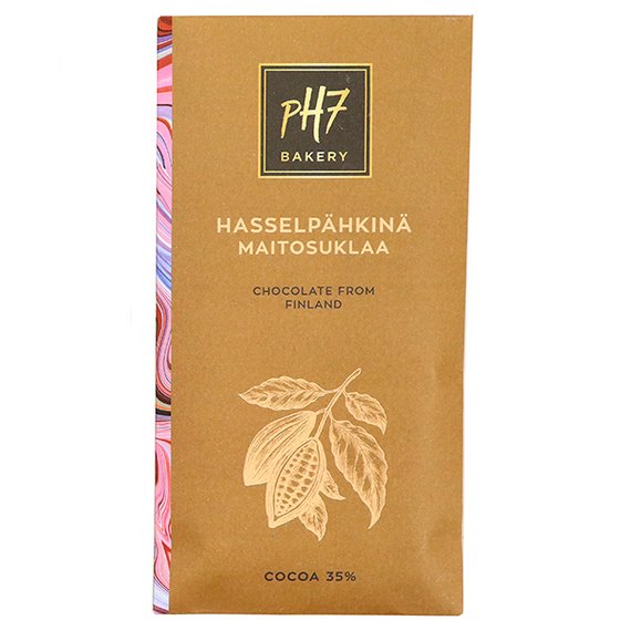 Kotimaisen PH7-konditorian kotimaisista raaka-aineista tehdyt suklaalevyt ovat makea lahja. Maista ja ihastu hasselpähkinä-maitosuklaaseen. Paino 100 g.