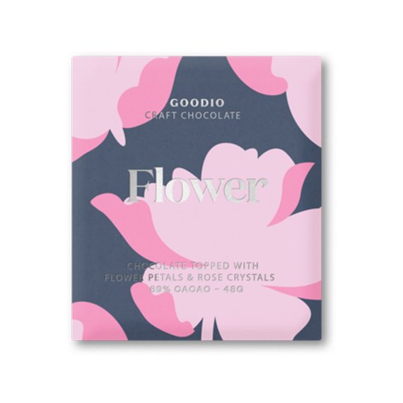 FLOWER: Suklaa, jossa päällä ripoteltuna kukkien terälehtiä ja ruusukiteitä. Sileässä ja rennossa suklaassa on pelargonioita, ruusuja ja ruiskukkia sekä koivusokeria.
