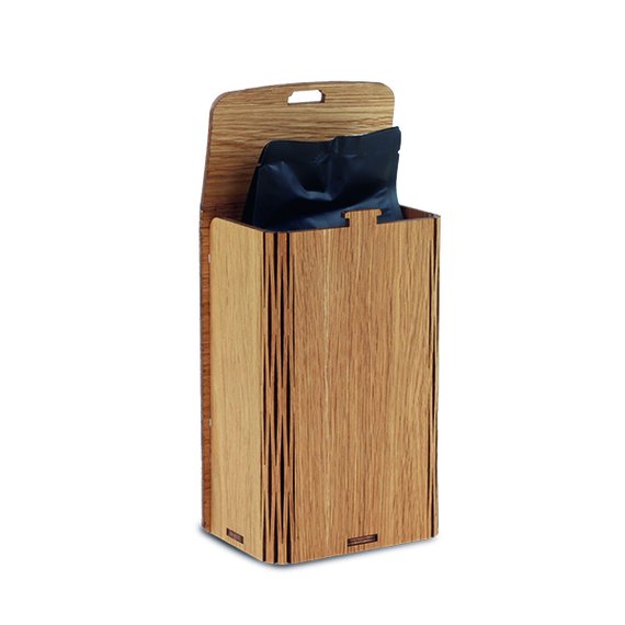 KOLO Designin öljytystä tammivanerista valmistettu kahvirasia on luonnonläheinen ja kaunis säilytysratkaisu kahvin ystävälle. Rasia sopii sisustuselementiksi pöydälle, mutta sitä voi hyvin säilyttää myös jääkaapissa. Viimeistele lahja laserkaiverruksella. Pakkaus sisältää kahvirasian lisäksi tammiset kahvipussinsulkijat. Rasian korkeus 198 mm, leveys 125 mm, syvyys 85 mm. Paino 390 g.