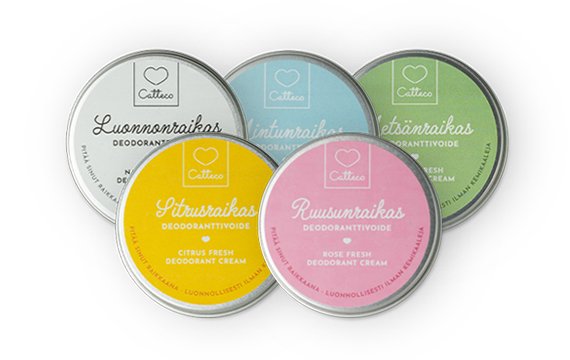 100% luonnollinen käsintehty deodoranttivoide ilman kemikaaleja tai alumiinia. Viisi erilaista vaihtoehtoa: sitrusraikas, ruusunraikas, mintunraikas, metsänraikas ja luonnonraikas.