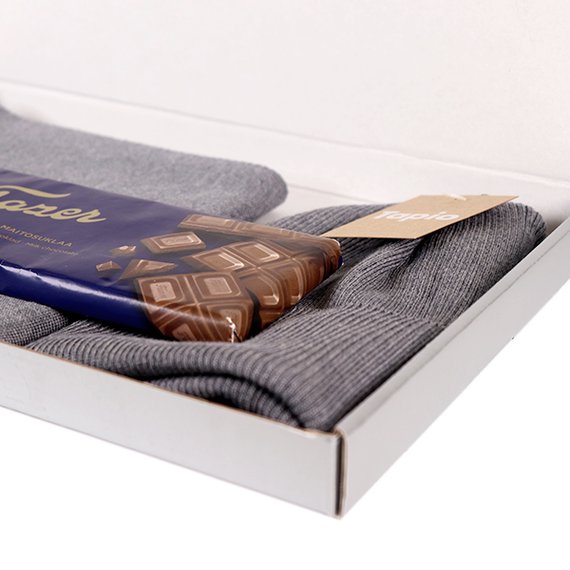 Merinovillaiset mutta kevyet Tapio-pipo ja -kaulaliina lämmittävät viileinä syyspäivinä ja sopivat asuun kuin asuun. Tuotteet valmistetaan Suomessa. Setin viimeistelee kotimainen Fazerin perinteinen maitosuklaalevy. Hinta sisältää pakkaustyön ja postituspakkauksen.