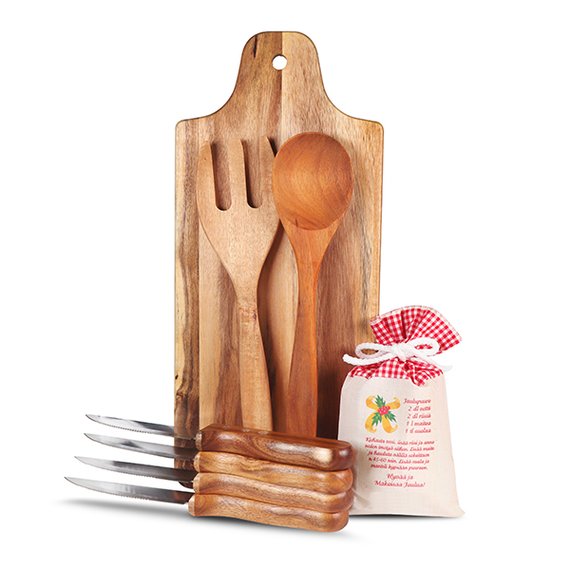 Joulussa parasta on hyvä ruoka. Tämä kaunis setti ilahduttaa jouluaamusta alkaen ja kruunaa kattauksen. Pakkauksessa on leikkuulauta ja 4 pihviveistä, akaasiapuiset salaatinottimet sekä puuroriisiä jouluisessa kangaspussissa. Hinta sisältää paketoinnin, sellofaanin ja narut.