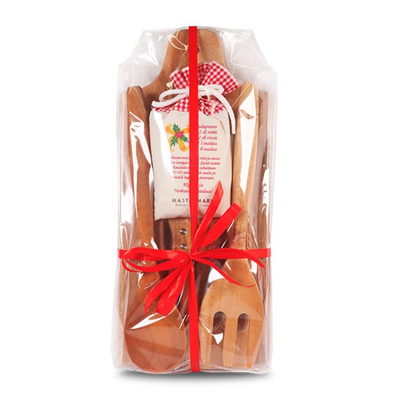 Joulussa parasta on hyvä ruoka. Tämä kaunis setti ilahduttaa jouluaamusta alkaen ja kruunaa kattauksen. Pakkauksessa on leikkuulauta ja 4 pihviveistä, akaasiapuiset salaatinottimet sekä puuroriisiä jouluisessa kangaspussissa. Hinta sisältää paketoinnin, sellofaanin ja narut.