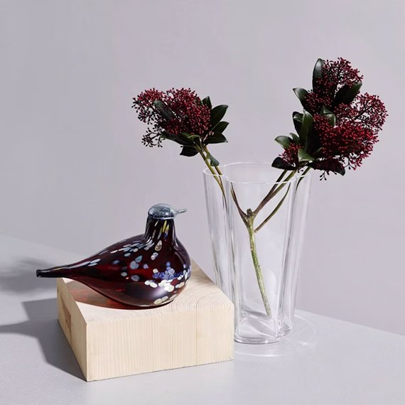 Oiva Toikan muotoilemassa lasilintujen kokoelmassa yhdistyy Toikan syvä suhde luontoon ja intohimo taidelasiin. Rubiinilintu on kaikkialla katseiden keskipisteenä. Linnun kuninkaallista olemusta korostaa syvänpunainen läpikuultava väri ja hohtavat täplät, joista valo heijastuu kauniisti. Jokainen lintu on valmistettu Iittalan lasitehtaalla suupuhaltamalla ja käsityönä valmistettu. Mitat 21 x 13 cm. Hoito-ohje! Puhdista kuivalla ja pehmeällä liinalla.
