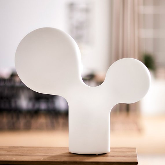 Polyeteenistä valmistettu näyttävä pöytävalaisin on suomalaista designia parhaillaan. Valaisin on varustettu energiatehokkailla, vaihdettavilla LED-valonlähteillä, ja sen kupu on valmistettu täysin kierrätettävästä materiaalista. Suunniteltu ja valmisteltu Suomessa. Suunnittelija: Eero Aarnio. Mitat: 580 x 530 x 280 mm. Paino 3 kg.
