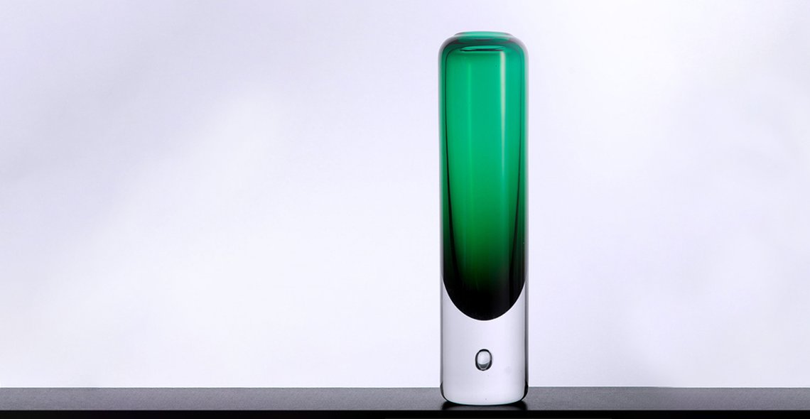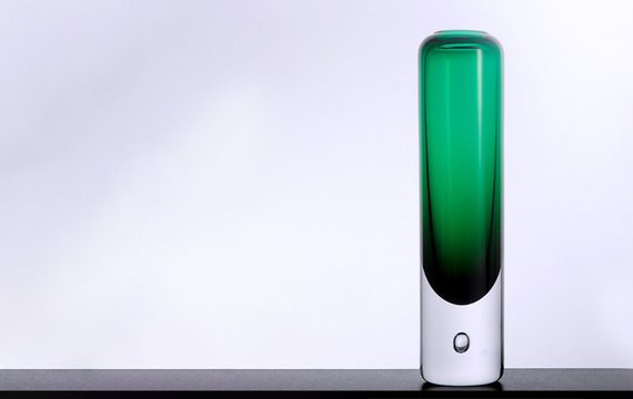 Upea Ritva-Liisa Pohjalaisen suunnittelema muottiin puhallettu lasimaljakko. Korkeus 26 cm.