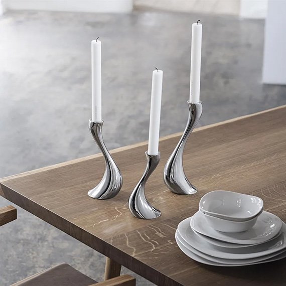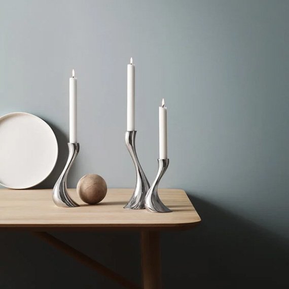 Cobra -kynttiläjalan aistillinen muoto on valloittanut monien sydämet. Leikkisä ja painovoimaa uhmaavan kynttilänjalan keveydellä on maaginen vaikutus - se kaksinkertaistuu, kun kynttilän valo heijastuu pintaan. Kynttiläjalan sunnittelijan saksalais syntyisen Constantin Wortmannin mukaan hänen töitään ei pidä ottaa liian vakavasti ja sen tulee herättää tunteita. "Muoto seuraa tunteita" on hänen mantransa. Valmistettu peilikiillotetusta ruostumattomasta teräksestä. Korkeus 160 mm. Setti sisältää 2 kpl kynttilänjalkoja.