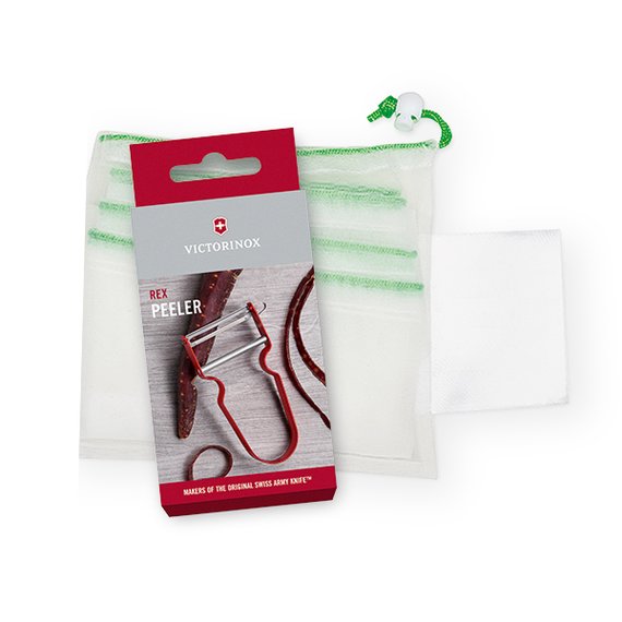Tämä lahjasetti on täydellinen kestävää kehitystä ja käytännöllisiä keittiövälineitä arvostavalle henkilölle! Pussit neljässä eri koossa, pestävät ja uudelleenkäytettävät. Ikoninen Victorinox kuorija tarjoaa nopean ja turvallisen kokemuksen, säilyttäen hedelmien ja vihannesten ravintoaineet.