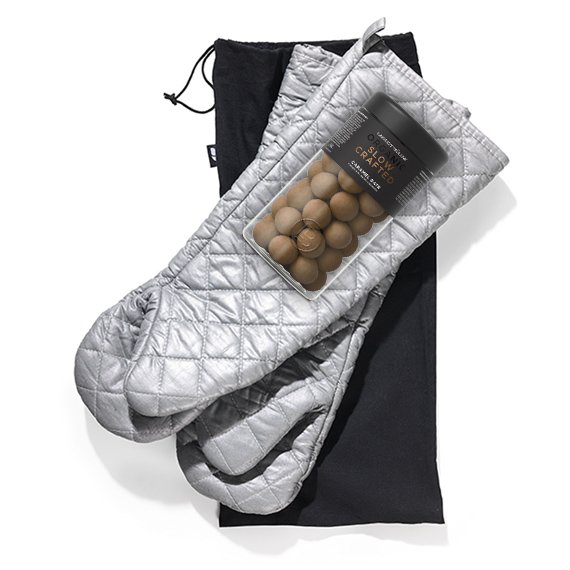 Lahjasetti sisältää tyylikkäät uunikintaat ja herkullista luksuslakritsia. Puuvillasta valmistetut uunikintaat tarjoavat tehokkaan suojan. Mukana on myös täyteläistä Lakrids by Bulow Caramel Date lakritsia, joka yhdistää pehmeän suklaan ja rapeat merisuolahiutaleet taateleiden kanssa. Tämä lahjasetti on täydellinen ruoanlaitosta ja herkuttelusta nauttivalle.