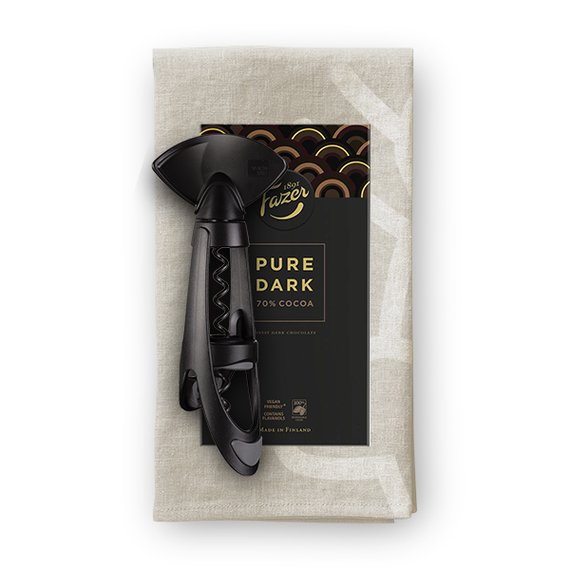 Skandinaavisella porokuosilla koristeltu vaalea keittiöpyyhe (koko 47 x 70 cm) ja suussa sulava Pure Dark 70 % cocoa -tummasuklaa. Mukana myös kätevä Vacu Vin korkkiruuvi kierrettävällä kahvalla. Rentoutuminen voi alkaa!