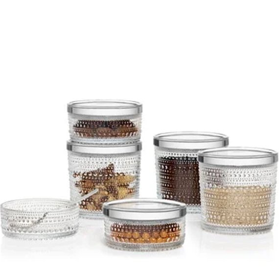 Kastehelmi-purkki on tyylikäs ja kestävä säilytysastia sekä kaunis sisustusesine. Sopii pikkuesineiden tai elintarvikkeiden säilyttämiseen ja tarjoiluastiaksi. Kirkas lasi tuo esiin selkeän puhdaslinjaisen muodon. Muovikansi pitää sisällön tuoreena. Valmistettu Suomessa Iittalan lasitehtaalla. Koko 116 x 116 x 57 mm. Paino 280 g.