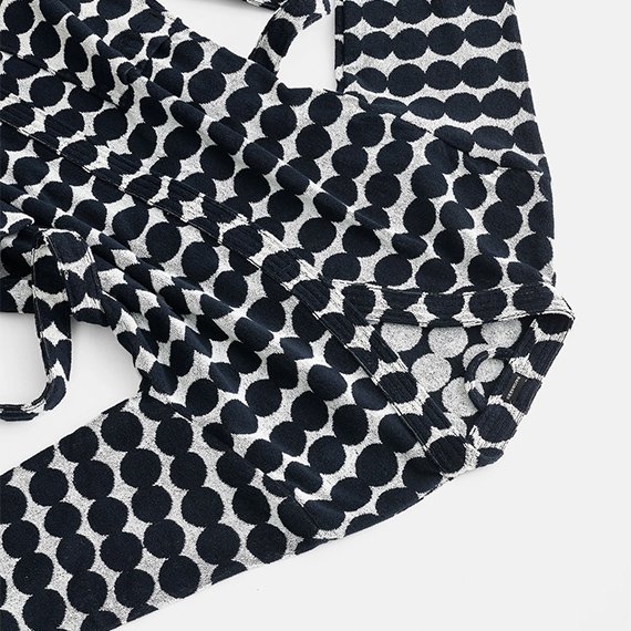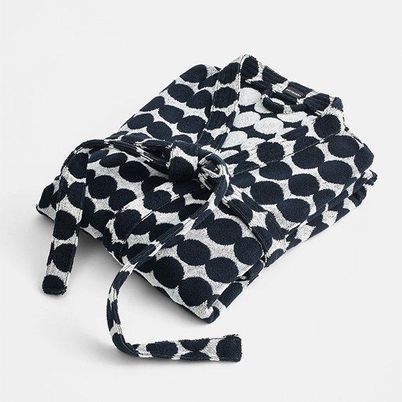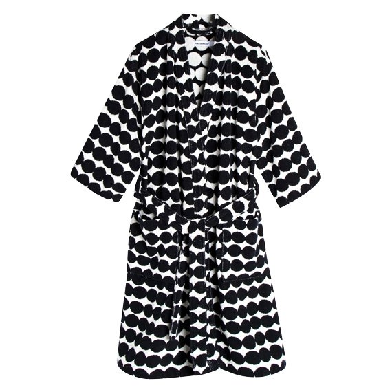 Pehmeä ja mukava puuvillafroteesta valmistettu kylpytakki Maija Louekarin suunnittelemalla Räsymatto-kuosilla. Oikean ja nurjan puolen värit ovat toistensa vastakohdat. Kylpytakissa on suuret taskut edessä ja irrotettava vyö. Koko S-XL.