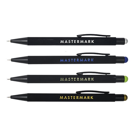 Tyylikäs musta kuulakynä erottuvalla metallinhohtoisella kaiverruksella. Kaiverrusjälki on samanvärinen kuin kynän kosketusnäyttöpää. Saatavilla olevat värit: punainen, sininen, vihreä, kulta ja hopea. Hinnat sisältävän laserkaiverruksen kynään aloituskuluineen.
