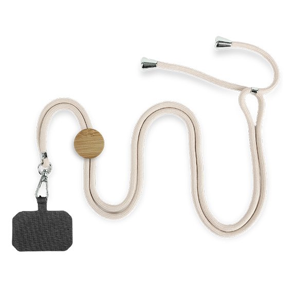 Yllättävä kumppani messuille, tapahtumiin ja matkustukseen! Säädettävä olka/kaulahihna, joka kiinnittyy helposti puhelimen ja kannen väliin. Puhelimen ollessa hihnassa, se on aina käden ulottuvilla ja voit huoletta kulkea ihmisjoukon läpi. Säädettävän puuvillasta valmistetun hihnan pituus on 160 cm. Logosi saat pyöreään FSC-sertifioituun bambusolkeen.