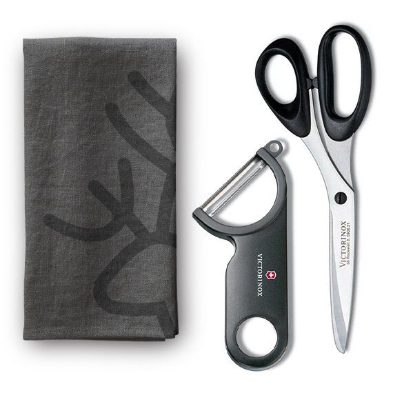 Laadukas Victorinoxin yleissakset ja vinopäisen kuorijasetin viimeistelee porokuvioinen keittiöpyyhe.