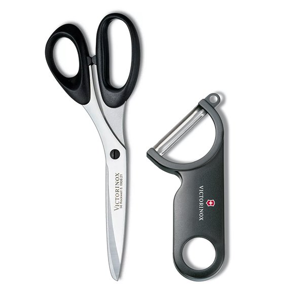 Laadukas Victorinoxin setti sisältää käytännölliset yleissakset ja vinopäisen kuorijan.
